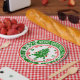 Modernes Weihnachtsdesign im Bauhaus-Stil mit einem gewagten geometrischen Baum in festlichem Rot und Grün.