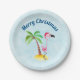 Party Teller mit dem Text: Frohe Weihnachten. Ein skurriler zeichn eines rosa Flamingos mit einer roten Weihnachtsmannmütze. Stehend auf einem Hang mit gelbem Sand und einer grünen und braunen Kokospalme im Hintergrund. Hellblauer Hintergrund mit einem schwachen polygonalen Muster. Niedliches und lustiges festliches tropisches Design.