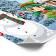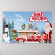 Illustration einer Weihnachtsszene mit einem Schneemann mit einem schwarzen Hut und einem grünen und roten Schal, einer Elf mit grünen Haaren und einem grünen Kleid, einem Lebkuchenwagen mit rot-weißer Fassade, einem männlichen Elf mit braunem Haar und einem stehenden grünen Outfit auf dem Wagen, einer grauen Katze mit gelben Augen, der Weihnachtsmann mit weißem Bart und einem roten Anzug . Der Hintergrund ist eine Winterlandschaft mit schneebedeckten Bäumen, einer weißen Eule, die auf einem Ast steht, und einer weißen Rentierfische-Silhouette. Die Worte "Frohe Weihnachten" sind rot-weiß über dem Auto geschrieben. Die Illustration erfolgt in einem Cartoon-Stil mit hellen Farben und einfachen Formen.