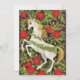 Malerei von Weihnachten Einhorn mit roten Poinsettia Blume und grüne Blätter auf einem dunklen Hintergrund. Auf der Rückseite ist eine poinsettia Blume mit grünen Blätter und die Inschrift Frohe Weihnachten.