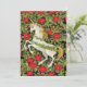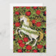 Malerei von Weihnachten Einhorn mit roten Poinsettia Blume und grüne Blätter auf einem dunklen Hintergrund. Auf der Rückseite ist eine poinsettia Blume mit grünen Blätter und die Inschrift Frohe Weihnachten.