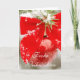 Eine hübsche rote Weihnachtsverzierung gebunden mit einem roten Samtbogen an einem Kiefernbaum in einem Schneesturm. Vordere Aufschrift auf Deutsch liest: Frohe Weihnachten oder frohe Weihnachten! Total kundengerecht als Sie bitte personifizieren!