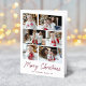 Moderne Urlaubskarte mit 6 Fotos in Collage. "Frohe Weihnachten" wird in einer handgeschriebenen Weinschrift mit Ihrem Familiennamen und dem unten abgebildeten Jahr gezeigt. Fügen Sie Ihre benutzerdefinierte Nachricht in die Innenseite der Karte hinzu oder verließ leer, um Ihre eigene zu schreiben. Auf der Rückseite der Multi-Foto-Urlaubskarte finden Sie ein weiße und weiße Weihnachtsbaummuster.