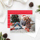 Die saisonale Fotokarte ist mit einem handgeschriebenen, "Merry Christmas"-Kalligrafiebuild-Design ausgestattet, das mit dem Jahr und Ihrem Familiennamen personalisiert werden kann. Auf der Rückseite der Karte befinden sich abstrakte, weiße, horizontale Streifen mit rotem Hintergrund. Bitte beachten Sie, dass die rot gedruckte Hintergrundfarbe geändert werden kann (siehe Weitere Option unter Anpassen dieser Vorlage), um sie mit Ihrem Foto abzustimmen.