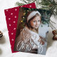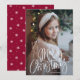 Niedliche Urlaubskarte mit "Frohe Weihnachten" am Ende der Karte in einem weißen handgeschriebenen Skript. Personalisieren Sie die skurrile Weihnachtskarte mit Ihrem vertikalen Foto und Familiennamen. Die Karte kehrt zu einem Cranberry- und weißen Schneeflockenmuster zurück.