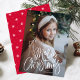 Niedliche Urlaubskarte mit "Frohe Weihnachten" am Ende der Karte in einem weißen handgeschriebenen Skript. Personalisieren Sie die skurrile Weihnachtskarte mit Ihrem vertikalen Foto und Familiennamen. Die Karte kehrt zu einem roten und weißen Schneeflockenmuster zurück.