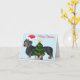 Eine schwarz-bräunliche Dackel mit einer Weihnachtsmannmütze hinter einem schönen Weihnachtsbaum.