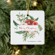 Dieser schöne Urlaubsstil besticht durch wunderschöne Aquarellrot-Blume mit Holly-Beeren, Nadelkronen und weiße Vegetation mit einem "Frohen Weihnachten" in einer handgeschriebenen Schrift | Kalligraphie. Auf der Rückseite des Ornaments befindet sich ein Foto für die individuelle Gestaltung. Finden Sie passende Artikel in der Holiday Red Winter Botanical Christmas Collection.