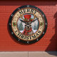 Dies ist eine festliche und charmante, kreisförmige Schildermalerei mit einem Rentier in einer schneebedeckten, waldreichen Umgebung. Der Rentier trägt einen roten Hut, der mit heiligen Beeren und einem karierten Schal in Rot und Schwarz geschmückt ist. Der Hintergrund zeigt eine friedliche Winterlandschaft mit schneebedeckten Bäumen. Das Bild wird durch einen rustikalen, holzstrukturierten Rahmen mit verzierten Blumenmustern und die Worte "MERRY CHRISTMAS" in fett gedruckten, gekrümmten Buchstaben gerahmt. Das gesamte Design hat ein warmes, Vintages Urlaubsgefühl.