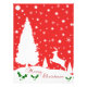 Frohe Weihnachts-Winterschneeflocken Rot und Weiß fröhliche Weihnachtsgeschichten, die einen roten Hintergrund mit weißen Sternen mit Weihnachtsbäumen und ein Hirsch auf dem schneebedeckten Boden darstellen. Akzentriert mit Heiligen und die Worte frohe Weihnachten.