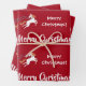 Moderne Weihnachtsgeschenkpackung mit den Worten "Frohe Weihnachten" in stilvoller Typografie, Schneeflocken, eine Illustration eines Einhorns (mit einem Mann und Schwanz mit rotem und goldenem Glitzer), das den Weihnachtsmann in seinem Schlitten zieht, und eines Weihnachtsbaumes. Auf einem roten Hintergrund. Beachten Sie, dass Sie den kleinen Gruß mit dem Namen eines Kindes personalisieren können.