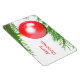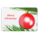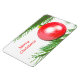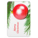 Dekorativer Weihnachtsmagnet mit meinem originellen Design des nahen Aufbaus eines großen, hellroten Weihnachtsballes, der von grünen Kiefernästen hängt. Im Text steht "Frohe Weihnachten".