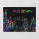 Eine helle, digitale Aquarellfarbe mit dekorierten Weihnachtsbäumen mit Lichtern, die in der Nacht leuchten.