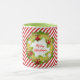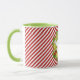 Die hellgrüne Combo-Tasse zeigt Frohen Weihnachtstext im Urlaubskrez auf rot-weiß gestreiften Mustern.