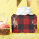 Fröhlicher Weihnachtstext in einem Land Seil-Design mit großen Buchhirschen auf rotem und schwarzem Büffel kariertem Hintergrund.
