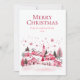 Frohe Weihnachts-Grußkarte mit einer Abbildung einer rosa und roten Stadt mit Schnee.