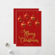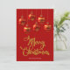 Frohe Weihnachten in einem extravaganten Schriftart mit dekorativen Schriften in goldenen Farbtönen mit Rot- und Goldtönen, die Weihnachtsbaubeldesign hängen. Diese rote Hintergrundfarbe Weihnachtskarte ist so konzipiert, dass Sie die Farbe des Hintergrunds ändern können und auch Ihren Familiennamen eingeben oder entfernen können, wenn Sie nur das Design ohne den Text haben möchten.