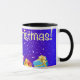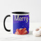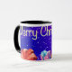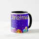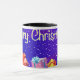 Frohe Weihnachts-Tasse Neujahr Geschenke vor dem Hintergrund des Nachthimmels und Schnee.