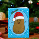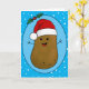 Adorable niedliche, fröhlich braune Cartoon Kartoffel mit einer rot-weißen Weihnachtsmannmütze. Die Kartoffel ist in einem Cartoon-Art-Stil und farbenfroh braun, hat Arme und Finger und ein großes glückliches Lächeln mit Augenpunkten. Die Weihnachtsmannmütze auf seinem Kopf ist rot mit einem weißen Trimm und einem weißen Pompom, der unten hängt. Er ist in einer hellblauen ovalen Form mit einem dunkelblauen Rahmen und zwei grünen heiligen Blätter mit zwei roten Beeren oben im Oval. Die Hintergrundfarbe ist hellblau und die weißen Schneeflocken schweben, um dieser niedlichen Saisonkarte ein festliches Gefühl zu geben. In der Karte befinden sich Vorlagen, die so verlassen werden sollen, wie sie sind, oder die den Text durch eine eigene Nachricht ersetzen. Auch in der Karte und auf der Rückseite sind die gleichen glücklichen Kartoffeln.