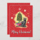 Das ist ein niedliches Weihnachtsdesign mit einem lebendigen, roten Hintergrund voller Sterne und winzigen Schneeflocken und einer schönen Katze vor einem Weihnachtsbaum. Schicken Sie Ihren Lieben Ihre liebevollen, gemütlichen und feierlichen Lebensräume!