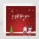Eine niedliche Weihnachtsabbild mit einem Schneemann, dem Weihnachtsmann, einem Weihnachtsbaum, Schnee und Sternen auf rotem Hintergrund.