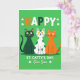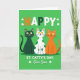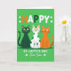 Diese Karte zeigt einen smaragdgrünen Hintergrund mit drei stilisierten Katzen, die wie enge Freunde nebeneinander sitzen und für ein Foto posieren 💚. Links ist eine tief dunkelgrüne Katze mit einer dunkelspitzigen Schwanzspitze, in der Mitte eine weiße Katze, die mit hellgrünen Punkten übersät ist, und rechts eine sonnige orange Katze mit einem dunkler gestreiften Schwanz. Sie schauen nach vorne mit großen gelben Augen, winzigen rosa Nasen und feinen schwarzen Schnurrhaaren, ihre kleinen Lächeln geben der Szene eine sanfte, liebevolle Atmosphäre. Oben erscheint "HAPPY" in ausgeschnittenen Buchstaben in Orange, Weiß und Dunkelgrün, die im oberen Bereich verteilt sind. Kleine weiße Kleeblätter schweben wie Konfetti um die Katzen herum ☘️. Unter dem Trio ist die Zeile "ST. CATTY'S DAY, unser Sohn" in weißer Schrift gesetzt und