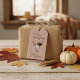 Dieses elegante Geschenktag im Herbst zeigt handgezeichnet Illustrationen in schwarzer Tinte mit einem Blumenkuhschädel vorne und einer Western-Herbsternte-Szene mit Kuhschädeln, Rose, Kürbissen, Herbstblättern, Ästen und Beeren auf der Rückseite, alles in einem eleganten Herbstfarbenschema. Hintergrund der Vintagen Rose.