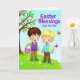 Diese Grußkarte zeigt zwei junge Jungen, die eng beieinander auf einem smaragdgrünen Rasen stehen, der mit verzierten Ostereiern übersät ist, ihre gemeinsamen Lächeln und rosigen Wangen deuten auf eine unkomplizierte Freundschaft hin 🐰. Ein blätterreicher Baum mit frischen grünen Ästen rahmt die linke Seite ein, während sich hinter ihnen ein hellblauer Himmel zu einer luftigen Frühlingskulisse öffnet. Der Junge links hat braunes Haar und trägt ein hellgrünes Hemd unter einer pflaumenfarbenen Weste, während er einen rosa Korb mit gestreiften Seiten hält, den er seinem Freund zuneigt, als wolle er ihn zum Hinschauen einladen. Der blonde Junge neben ihm trägt ein himmelblaues Hemd und hält ein größeres hellgrünes Ei mit zarten, naturähnlichen Mustern hoch, als ob er stolz einen Fund präsentieren würde. Ihre entspannte, leicht zueinander geneigte Haltung und die Art, wie ihre Gesichter einander zugeneigt sind, verleihen der Szene eine zarte, kameradschaftliche