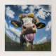 Ein spielerisches, nahes Bild einer Kuh, stehend auf einer sonnigen Wiese, geschmückt mit einer blühenden Krone aus Molkereien und Wildblumen. Die Kuh hält sich die Zunge heraus und verleiht der Szene eine Touch Spaß und Charme. Der hellblaue Himmel und weiche Wolken im Hintergrund verstärken das fröhliche und skurrile Erscheinungsbild des Bildes.