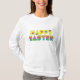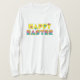 Fröhliche Ostern. Ein netter, niedlicher Ostern-Gruß auf einem attraktiven Shirt. Das glückliche Wort ist in einem hellen heitren Gelb, und das Wort Ostern ist in einem Regenbogen der Farbe. Beide werden mit Blumen besprüht. Sie können die Shirtfarbe und oder Art ändern, wenn Sie mögen. Wollen Sie dieses oder einen ähnlichen Entwurf auf einem anderen Einzelteil? Besichtigen Sie meinen Sensato Speicher.