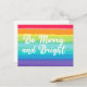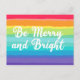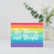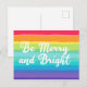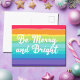 Schöne Gay Pride Weihnachtskarte in hübschen Regenbogenfarben, die lautet Be Merry and Bright. Seien Sie laut und stolz auf den herrlichen LGBTQ-Feiertag.