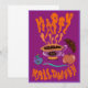 Original Illustration einer Katzenliebhaberwitsche Tasse Kaffee mit giftiger Tasse, Hexe, Kürbis, Zauberstab und kleinen Dampfgeistern mit handgeschriebenem Sprichwort Happy Halloween. In orangefarbenem und lila, maximalistischem Stil und Farben.