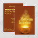 Mystische Halloween-Illustration mit Hexenkaldron mit kochender Flüssigkeit, leuchtenden Funken und tropfender "Halloween-Einladung"-Typografie im heißen Dampf.