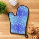 Front and back views of an oven mitt. The front is blue with white polka dots, and the back is silver with a quilted pattern. Black trim outlines both sides.