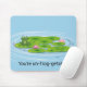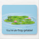 Niedlicher grüner Frosch auf einem Lilienpolster mit rosa Seerosen und Wasserpfeifen für Freunde oder Familienmitglieder. Text kann bearbeitet werden.