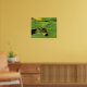 Dieses Poster zeigt einen grünen Frosch, der unter seinen Lilienpolstern auf den Fotografen guckt. Es hat gerade aufgehört zu regnen. Die Sonne wird auf den Wassertropfen reflektiert. Die Größe einiger gefallener Blätter zeigt, wie klein dieser kleine Typ ist.