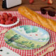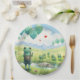Ein fröhlicher Frosch mit blaugrünen Ballons steht an der Spitze einer üppigen Wiese, im Hintergrund sind mehrere andere Frösche darstellend, ein synchronisierter Tanz. Zwei kleine, rote, herzförmige Ballons schweben inmitten der größeren Ballons und fügen eine Touch Launen hinzu.
