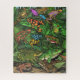 Viele bunt gefärbte Frösche, die unter grünen Blätter stehen.