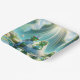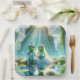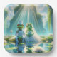 Braut und pflegen grüne Frösche auf einem Lilienpolster in einem Teich mit Liegestühlen im Hintergrund.
