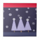 Ein hübsches Design mit drei blauen Weihnachtsbäumen auf tiefblauem Hintergrund. Sanfte Schneeflocken fallen. Eine rote Feriengrenze oben.