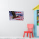 Ein wunderschön patriotisches Bild eines amerikanischen Adlervogels, der über schneebedeckte Berge hinaufsteigt, auf einer schwingenden amerikanischen Flagge, die von tiefgefrorenem Schnee und Eis umgeben ist. Das gefrorene Foto wurde von Rob Boyer, einem mit Augen, scharf-scharfen Fotografen, aufgenommen.
