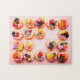 In diesem hübschen Puzzle mit kleinen Donuts oder Dudelsacken, die mit Obst und Zuckerguss bedeckt sind, macht sich der Vergnügen für den Feinschmecker. Rosa, Orange, lila, Rot, Weiß, Blau, Orange und grüne Touchs. Würde ein schönes gerahmtes Stück machen, wenn du fertig bist.