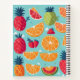 T - Shirt mit lebhaften Abbildungen von Sommerfrüchten wie Wassermelone, Ananas oder Zitrusfrüchten. Helle und saftige Farben, Intensivfarben, Kawaii, Kontur, Weißer Hintergrund, Sie können es jemandem, der Ihnen nah ist, groß oder klein, schenken