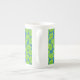 Fruchtige grüne Grenzen auf blauem Hintergrund, um Prozellantasse