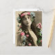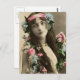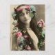Vintag gefärbtes Foto einer jungen Frau mit langen Haaren, eine farbige Kapelle um ihren Kopf und viele Blume überall auf ihr.