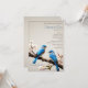 Ein Bluebirds Hochzeitsprogramm zum Thema Bluebirds für Ihre Gäste mit einem Frühjahrsprogramm. Das Programmdesign besteht aus einem Paar Bluebirds, die auf einem Holzzweig ruhen, dessen Feder vor einem texturierten Hintergrund aus Papier blüht. Personalisieren Sie mit dem Bräutigam und den Namen der Braut zusammen mit dem Hochzeitstag und der Reihenfolge der Zeremonie Details. Zusätzliche Hochzeitsarbeit mit diesem Design verfügbar.