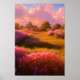 Dieses digitale Kunstwerk zeigt ein weitläufiges Feld mit üppig grünem Gras und zarten rosa Blume. In der Ferne können einige Bäume an einem Himmel mit warmen Tönen von der untergehenden Sonne gesehen werden. Sonnenstrahlen strahlen durch die Wolken und schaffen eine friedliche und ruhige Atmosphäre. Die perfekte Ergänzung zu jedem Raum, der eine Touch von natürlicher Schönheit und Ruhe braucht.