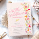 Eine kleine Wildblume ist unterwegs! Hübsche Frühjahrsdusche mit Blütendusche mit hübscher Handgemälde in kräftigen Orangen-, Rosa- und Gelbblüten, Aquarellbildern mit modernem, elegantem Drehbuch-Schriftart, böhmischem Grün auf Pastellrot. Ideal für Frühling, Sommer im Freien Garten Babydusche Party.