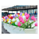 Eine bunte Vielfalt an Tulpen in einem langen Blume-Bett aus weißem Holz an der Wand des Aqueduct Paddock. Ein Blumenarrangement aus rosa, weiß, lavender, rot und gelb Tulpen ist eine schöne Vorschau für die Frühjahrszeit im Big A. Der Hintergrund zeigt die berühmte Tribüne dieser historischen Rennstrecke, die 1959 wieder aufgebaut wurde. Fleetphoto