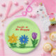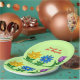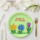 Hübsche Blume im Grünen mit goldgelber Blume, blauer Blume und lila Tulpe mit grünen Blätter. Mit der Formulierung, Lächeln und in rotem Text glücklich sein. Teller zum Einweg-Papier im Frühling und Sommer. Verlass oder personalisiere oder lösche Text. Auf einem hübsch hellgrünen Hintergrund angezeigt. Original Grafikarbeit von TamiraZDesign.